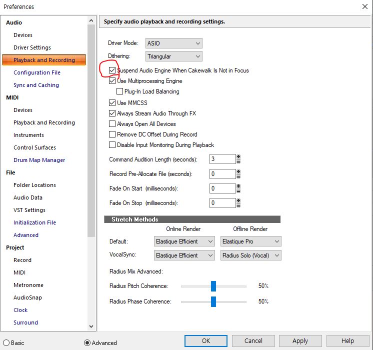 Edit > Preferences > Playback and Recording 로 들어가 'Suspend Auto Engine When Cakewalk in Not in Focus'의 체크박스를 확인해보자.