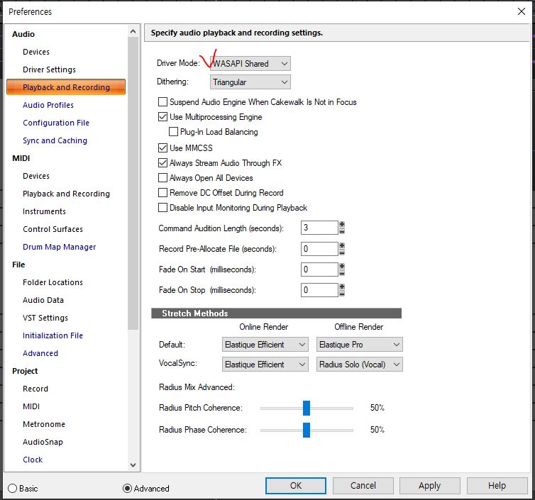 다만 동영상 시청을 끝내고 다시 Cakewalk를 사용하기 위해서는 Driver Mode를 다시 원복(보통 ASIO)시켜야 Cakewalk에서 작동되는 악기소리를 들을 수가 있다.